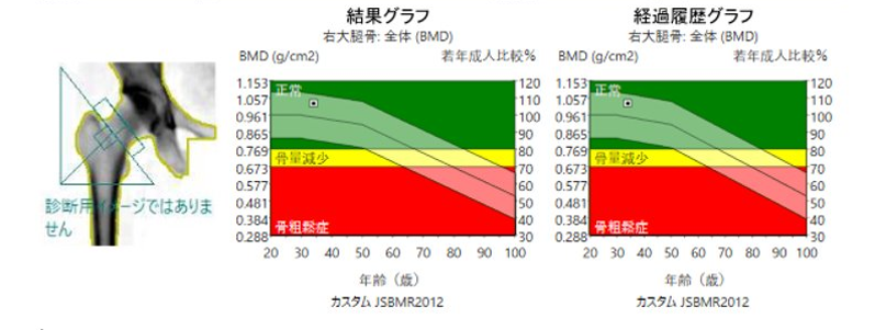 転倒時に骨折することが多い大腿骨頸部の骨密度を測定します。もし、大腿骨頸部が骨折してしまったら、ねたきりの原因となることがあります。よって大腿骨頸部の骨密度測定を行うことが重要視されています。