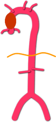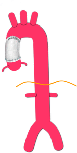 大動脈疾患に対しての治療は大きくわけて、開胸、開腹にて瘤を切除し人工血管に置き換える人工血管置換術と、開胸、開腹を要しないカテーテルによる血管内治療があります。