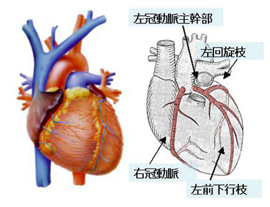 また左冠動脈が狭くなると生命に関わります。特に左冠動脈の根本(主幹部)が閉塞すると突然死する危険性が高いことがわかっています。