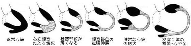 梗塞、繊維化の範囲が広いと、その機能低下を補うため、健常の心筋に負担が生じ、心拡大が起こり、心機能低下が左室全体におよび難治性の心不全に至ります。