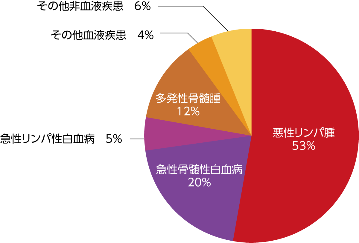 入院となる患者さんの疾患の内訳は悪性リンパ腫が約51%と最多であり、急性白血病が約24%、多発性骨髄腫が約10%、骨髄異形成症候群が約5%とこれに続きます。残りの約10%が再生不良性貧血や特発性血小板減少性紫斑病(免疫性血小板減少症)、感染症などの症例です。