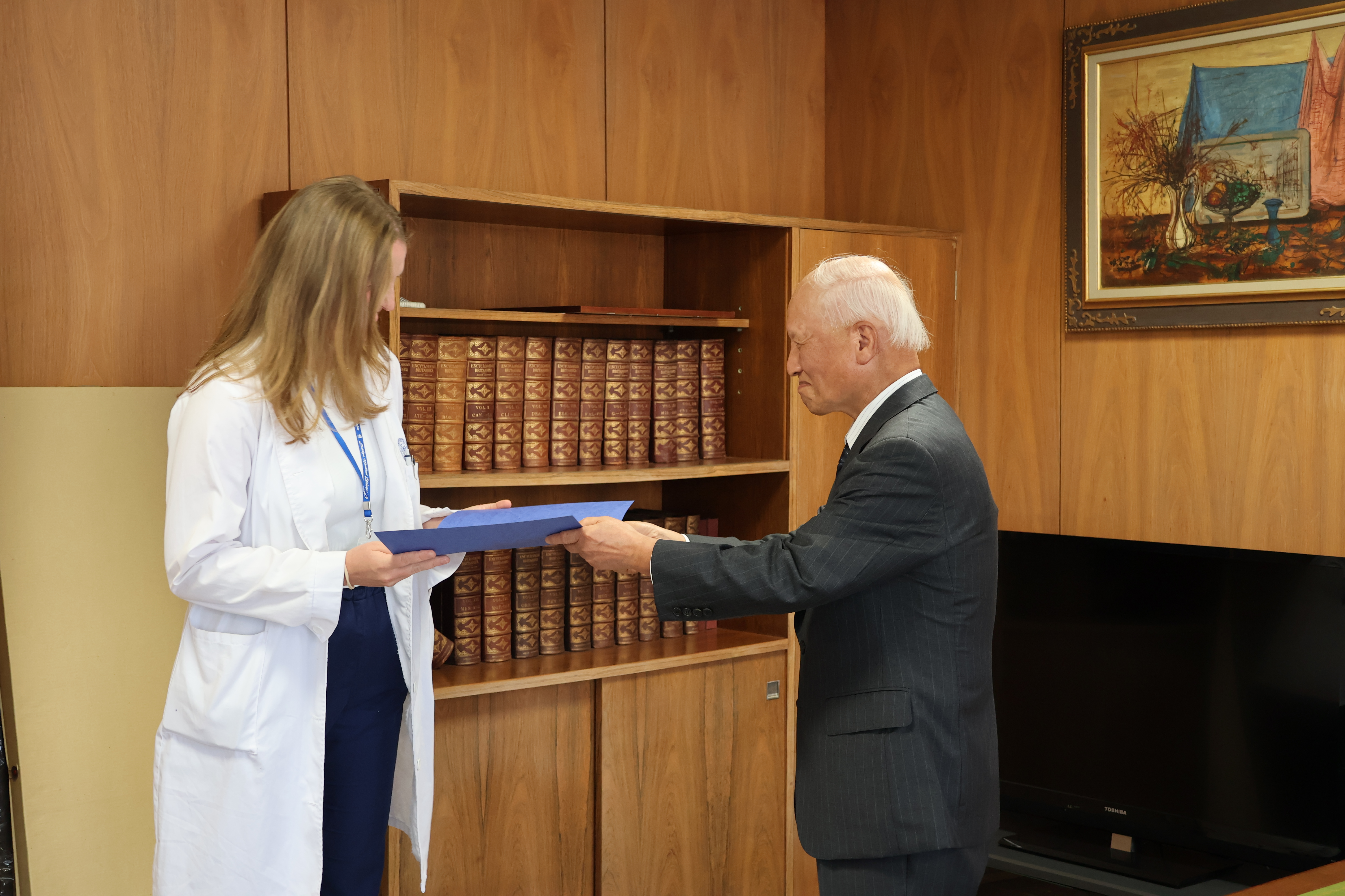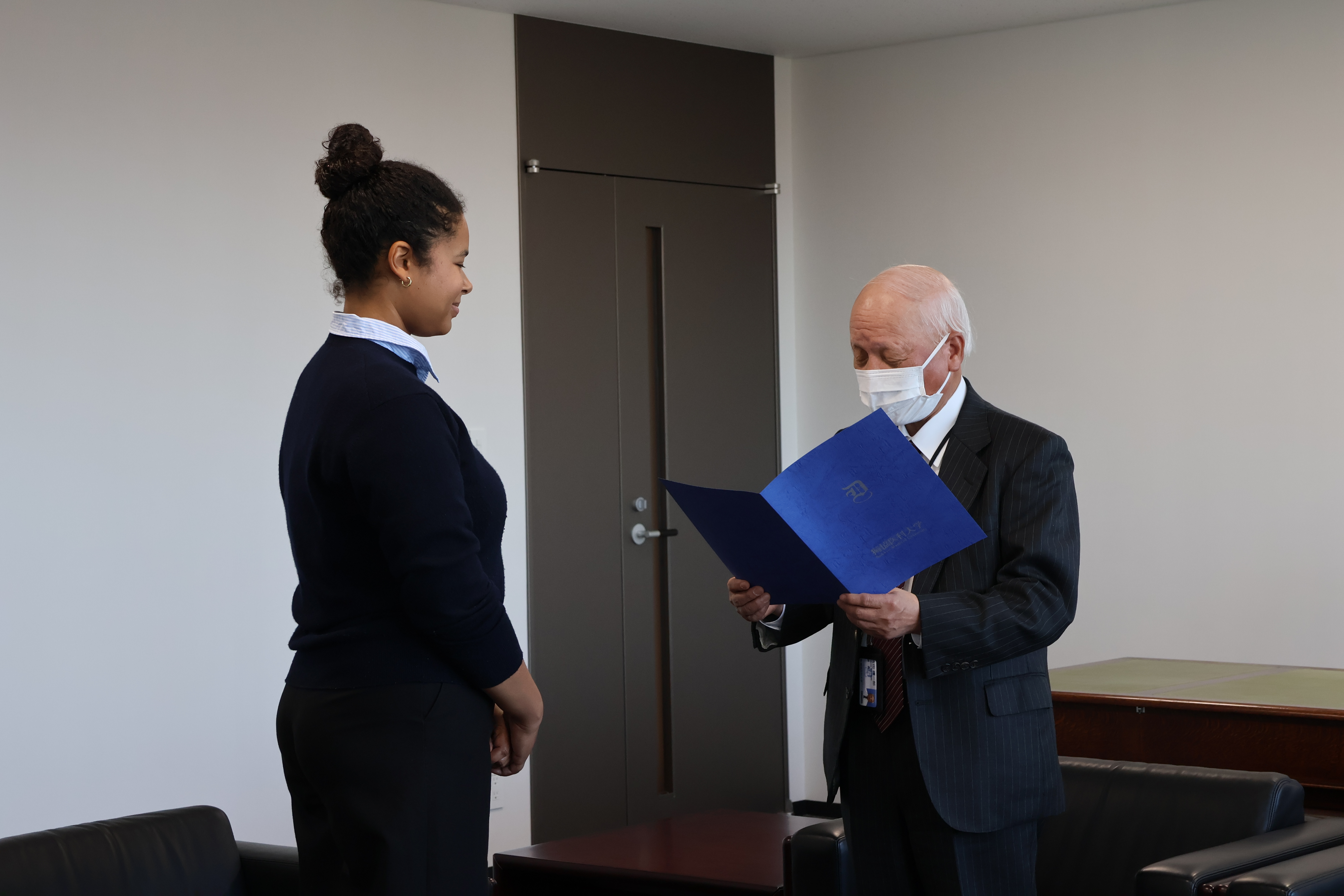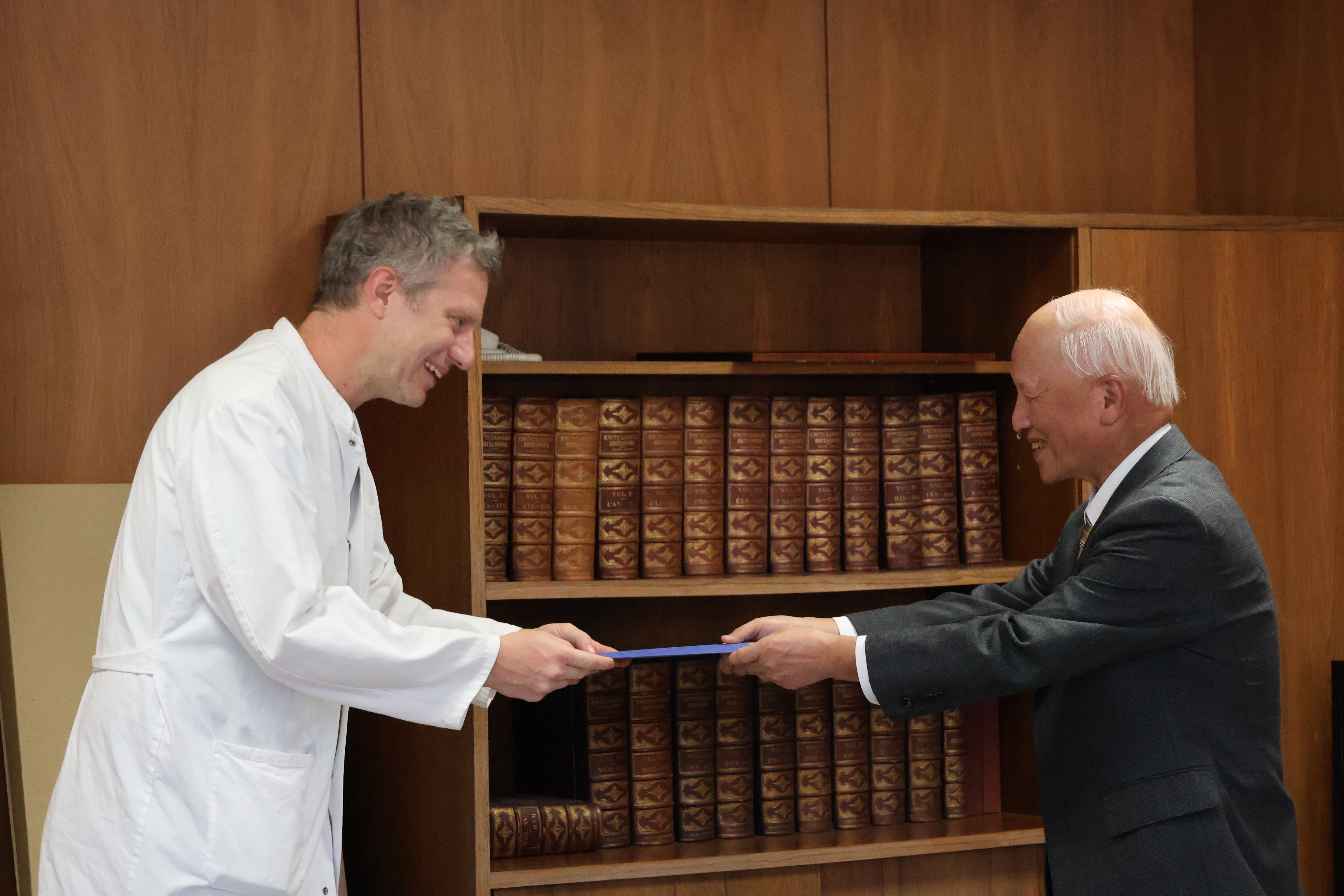 ドイツ・ミュンヘン工科大学医学部からの研修生2名の修了式を行いました。2名とも11月17日から1月9日まで、1名が内科学(消化器)、内科学(血液・腫瘍)で、もう1名は内科学(心臓・血管)、内科学(血液・腫瘍)で研修を行いました。