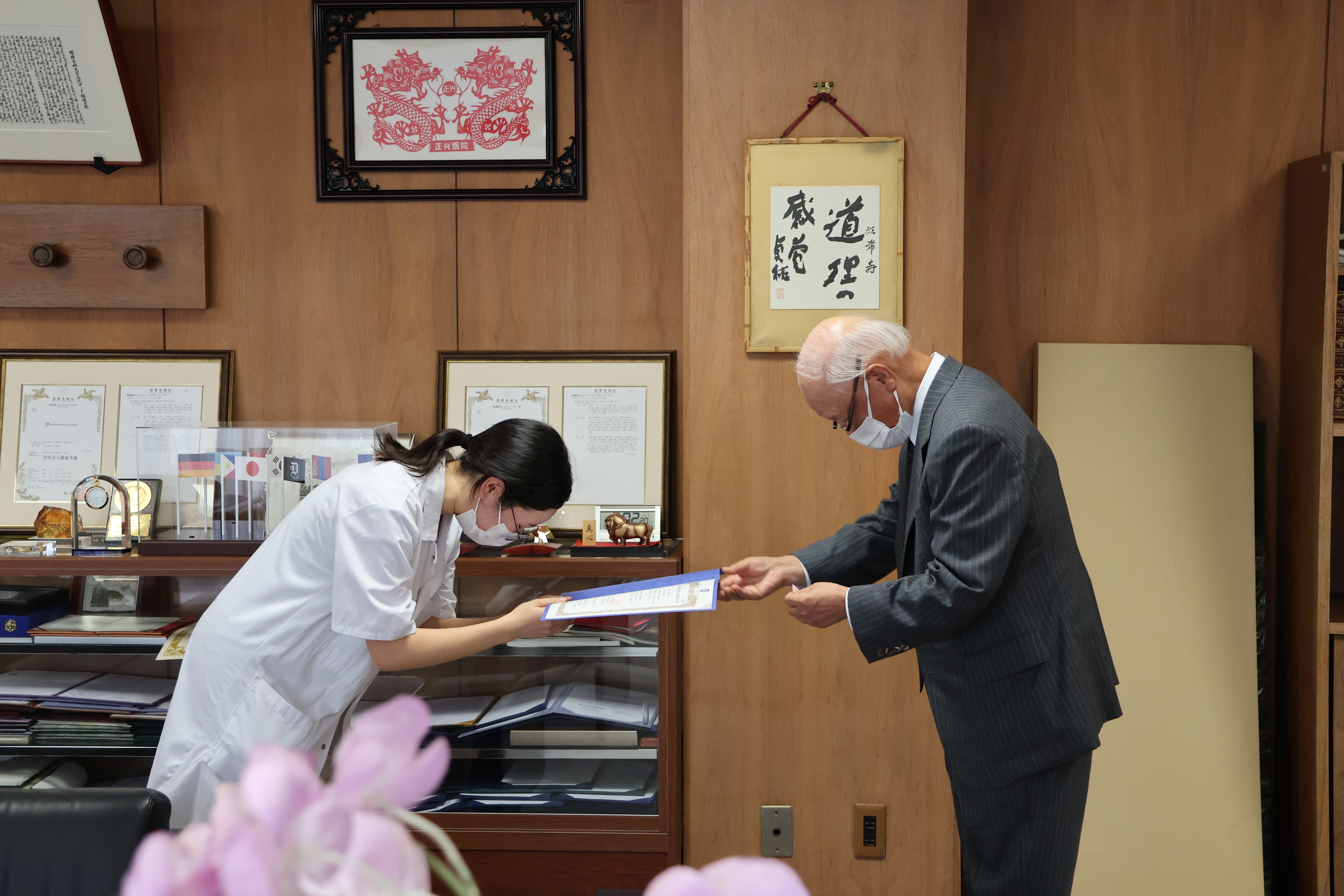 国立フィリピン大学マニラ校からの研修生2名が修了式を行いました。2名の学生は、6月30日から7月25日まで、泌尿器科、病理診断科でそれぞれ研修を行いました。