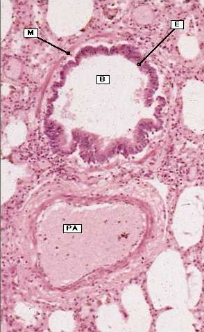 Micrograph of an H&E stained section showing a bronchiole (B) close to a